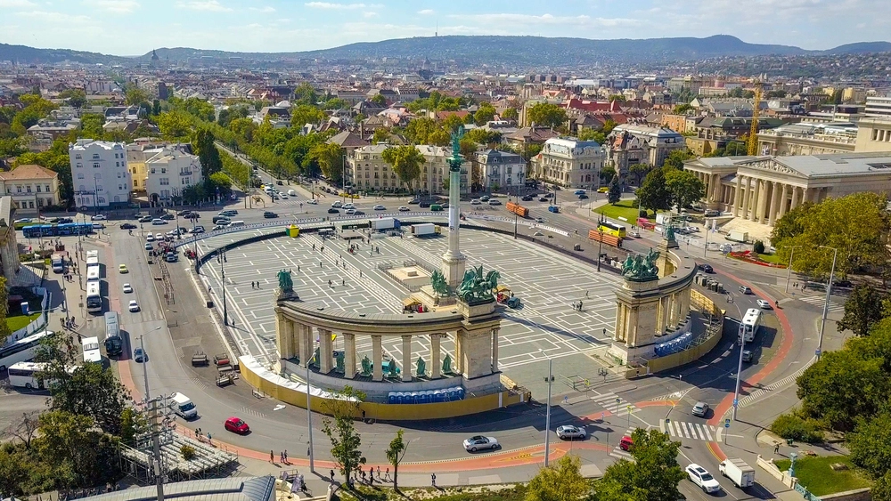Aerial view of Heroes’ Square in Budapest with the Millennium Monument and surrounding cityscape, one of Hungary’s most iconic landmarks.