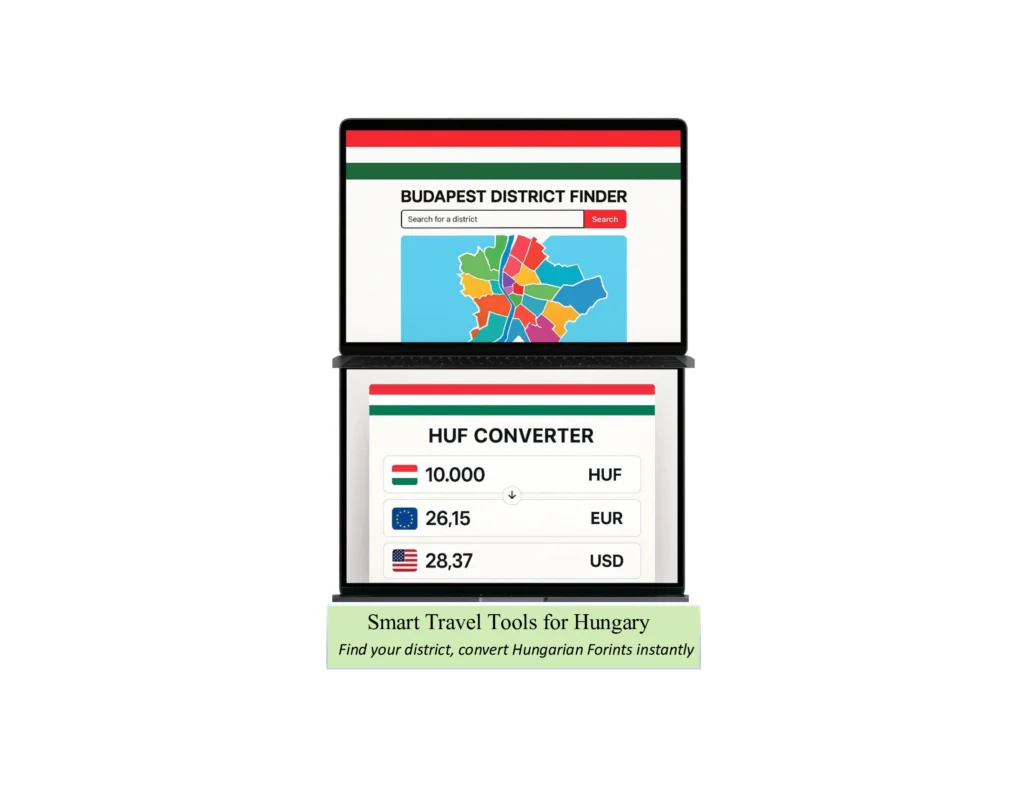 Smart Travel Tools for Hungary – Budapest District Finder and HUF Converter displayed on laptop screens for easy trip planning.